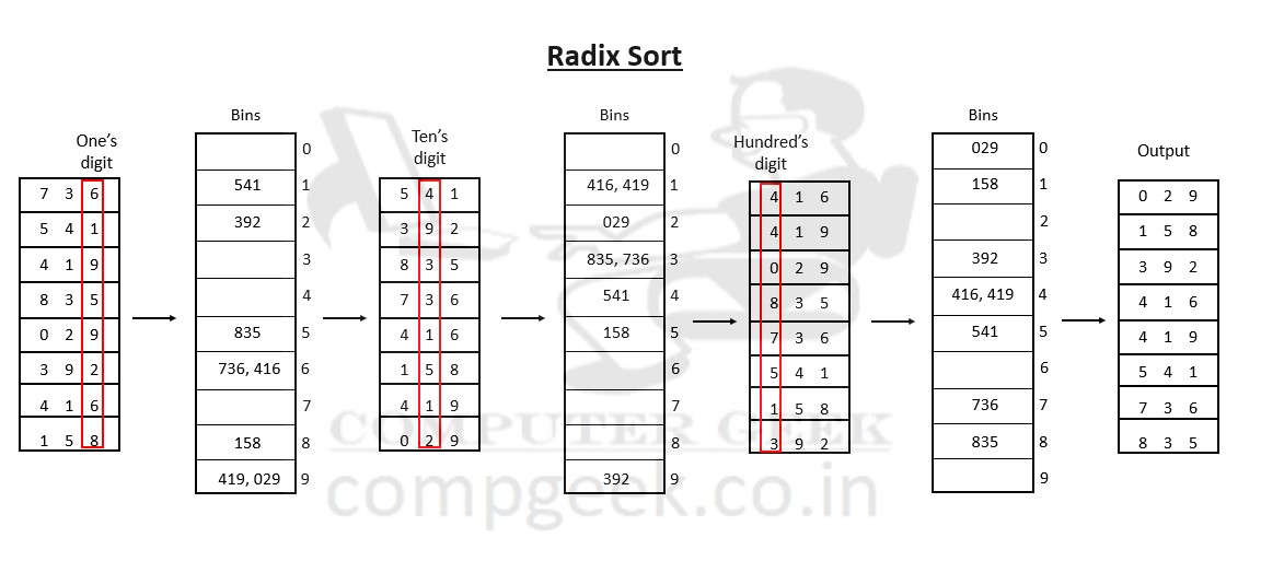 0to9, preserving order. - Repeat the above steps for the tens digit, then the hundreds digit, and so on.