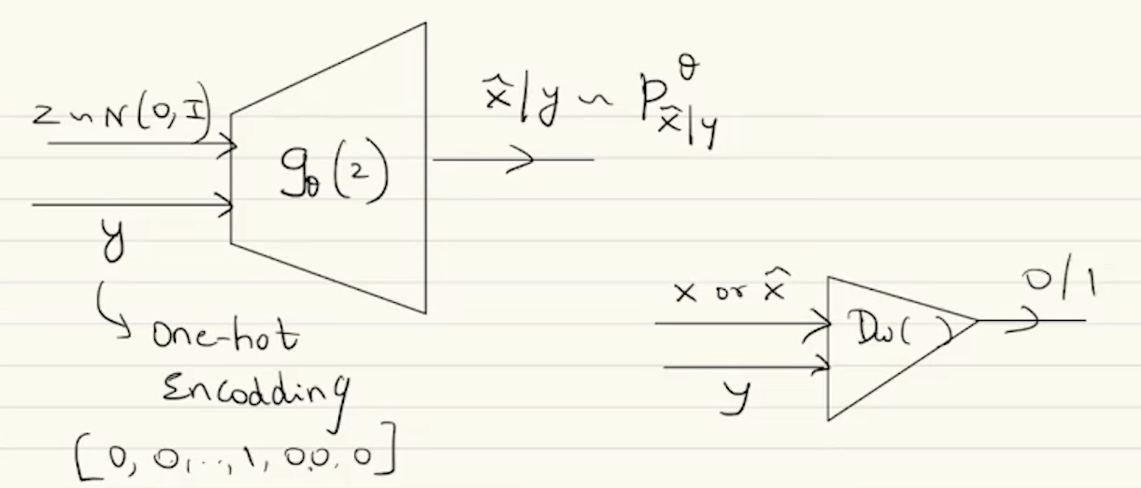 - Instead of just seeing , the discriminator sees . It now answers “Is a real sample consistent with condition “.